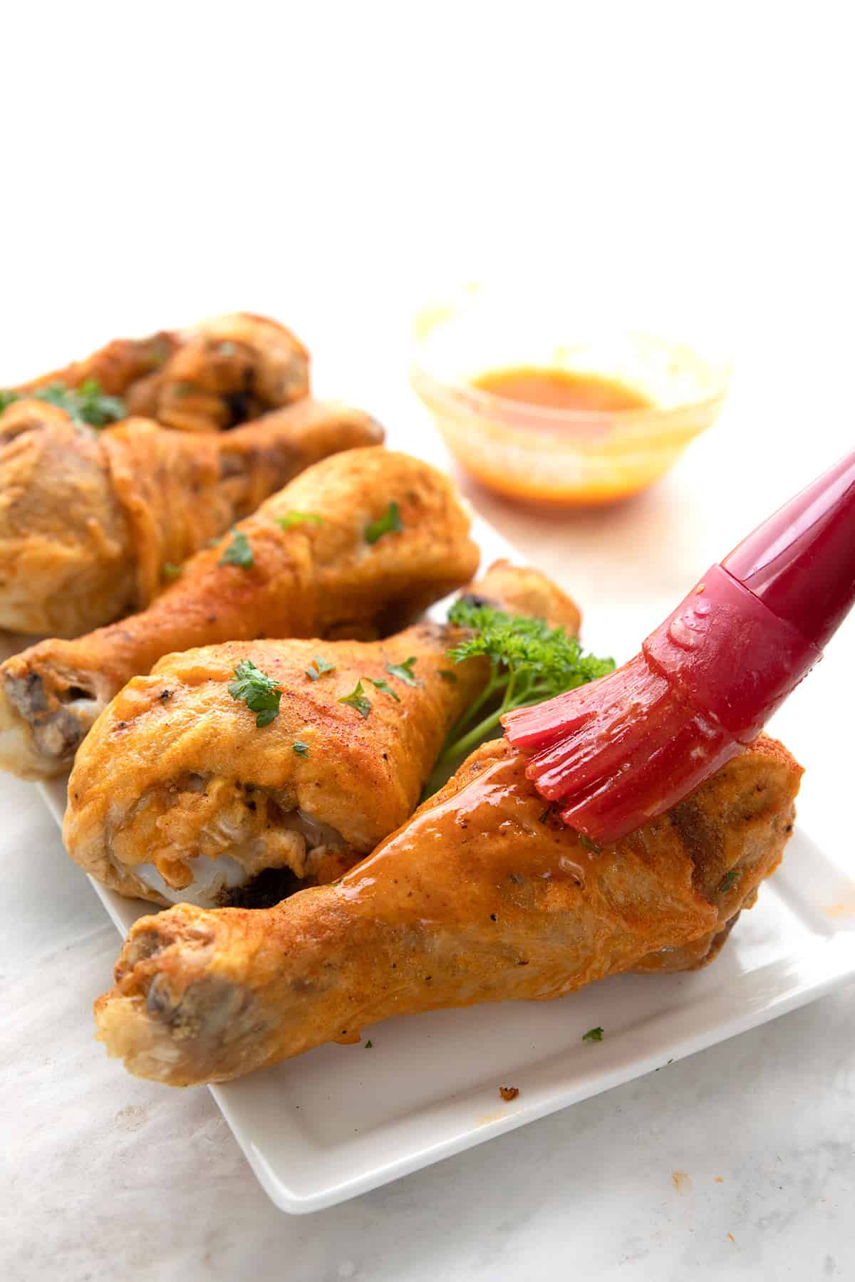 For food safety, never rinse raw chicken because it can spread bacteria around your sink. Instead, pat the chicken legs dry with paper towels before seasoning it. Chicken legs are fully cooked when they reach an internal temperature of 165ยบF near the bone (I prefer 170ยบF for extra tenderness). I always use an digital meat thermometer to check the thickest part of the chicken leg. It takes the guesswork out and guarantees juicy chicken every time.
