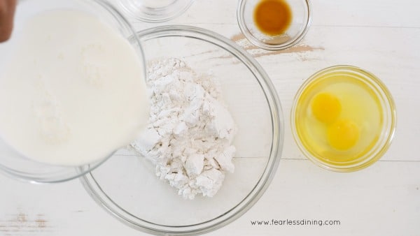 Step 2: Add the wet ingredients to a smaller bowl. Whisk to blend. Pour the wet ingredients into the dry ingredients and mix. This gf crepe recipe is made dairy-free, but you can use regular dairy milk if you can eat dairy, and it will work beautifully. The batter will have the consistency of heavy cream.