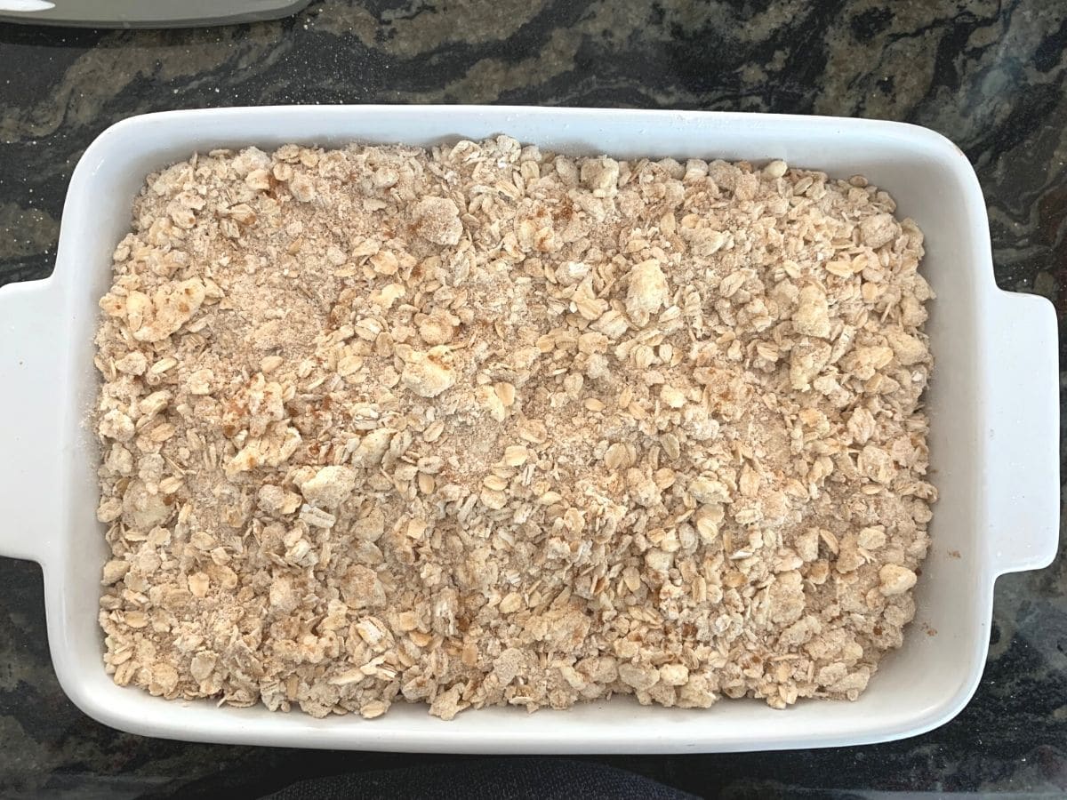 Step 6: Sprinkle the oat topping evenly over the apple layer. Do not pack it down. One of my favorite parts about this recipe is that I don’t skimp on the crisp topping…it makes a huge difference in flavor!