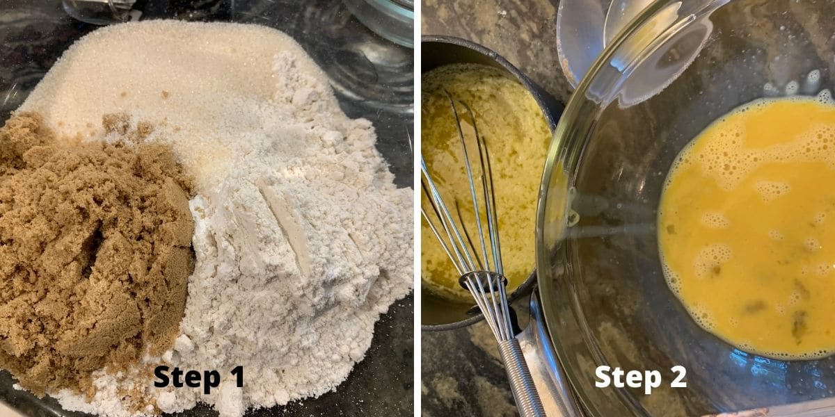 - In a small mixing bowl, add the brown butter, 3 large eggs, and 2 teaspoons pure vanilla extract. Whisk to blend them. Pour the wet ingredients into the dry ingredients. Optional: add the 1/2 cup chocolate or butterscotch chips. Mix well.