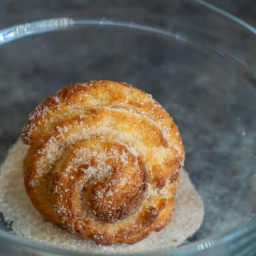 Step 13: Roll the cruffin in a bowl of cinnamon sugar while it is still warm. If you want more sugar to stick, brush the cruffin with melted butter first. I find when the cruffin is warm, the sugar sticks easily.