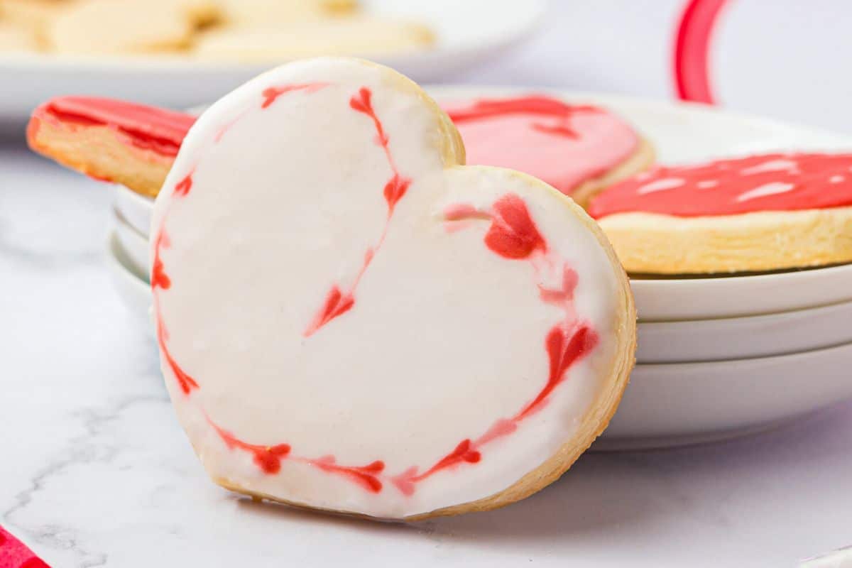 - To make the dragged heart pattern. Cover the top of the cookie with one color of icing. I used white so the hearts stand out.