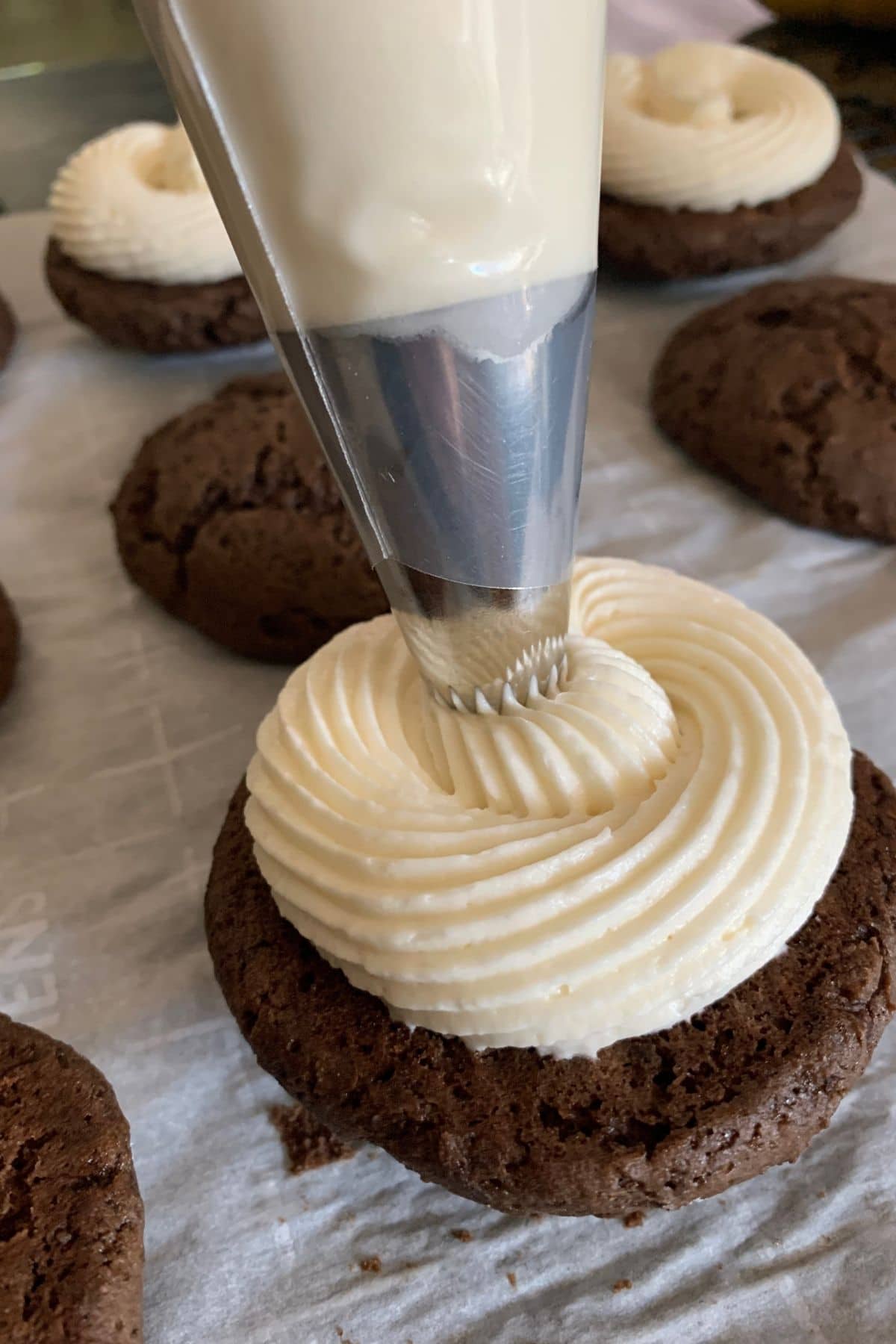 If you don’t have a piping bag, you can spread or spoon the frosting on. I have also dropped frosting onto the bottom half with a small ice cream scoop.