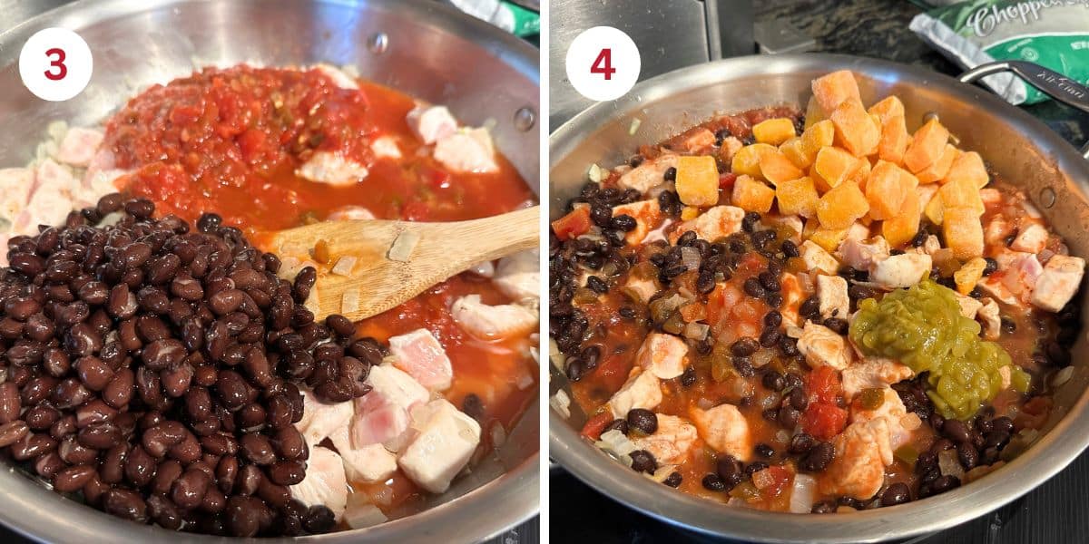 Step 4: Mix in chiles and squash. Add the can of green chiles and the frozen butternut squash. Stir to mix the ingredients. Cover and reduce the temperature to medium-low heat.
